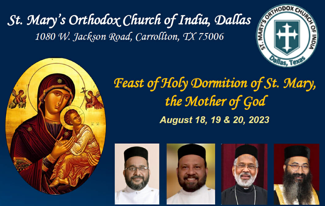 കരോൾട്ടൻ (ടെക്സസ്) : കരോൾട്ടൻ സെന്റ് മേരീസ് ഓര്ത്തഡോക്സ് ദേവാലയത്തില് വിശുദ്ധ ദൈവമാതാവിന്റെ പെരുന്നാൾ ഓഗസ്റ്റ് 18, 19, 20 (വെള്ളി, ശനി ഞായര് ) തീയതികളില് വിവിധ പരിപാടികളോടെ വിപുലമായി ആഘോഷിക്കും.
