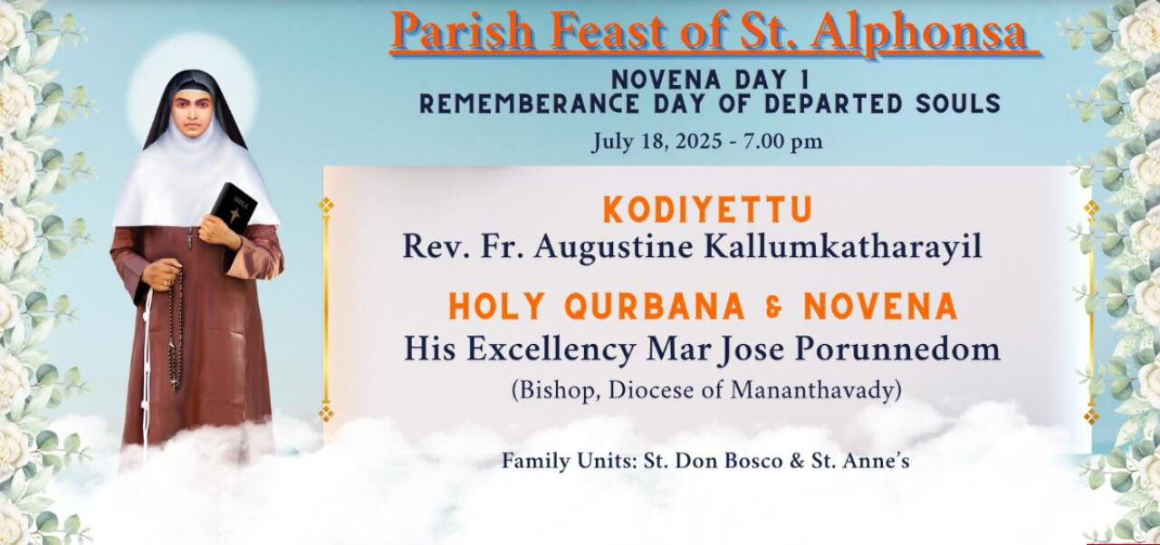 മിസ്സിസാഗ : സെൻ്റ് അൽഫോൻസാ സീറോ മലബാർ കാത്തലിക് കത്തീഡ്രലിൽ വിശുദ്ധ അല്‍ഫോന്‍സാമ്മയുടെ തിരുന്നാള്‍ വിവിധ പരിപാടികളോടെ ആഘോഷിക്കുന്നു. ജൂലൈ 18 വെള്ളിയാഴ്ച കൊടിയേറി ജൂലൈ 27 ഞായറാഴ്ച തിരുനാൾ സമാപിക്കും. തിരുനാളിനോടനുബന്ധിച്ച് ജൂലൈ 18 മുതല്‍ 26 വരെ ദിവ്യവലിയും നൊവേനയും അർപ്പിക്കും. ജൂലൈ 25, 26, 27 തീയതികളില്‍ കഴുന്ന്, മുടി എന്നിവ സമര്‍പ്പിക്കുവാന്‍ അവസരം ഉണ്ടായിരിക്കുന്നതാണെന്ന് ഇടവക വികാരി ഫാ. അഗസ്റ്റിന്‍ കല്ലുങ്കത്തറയില്‍ അറിയിച്ചു.