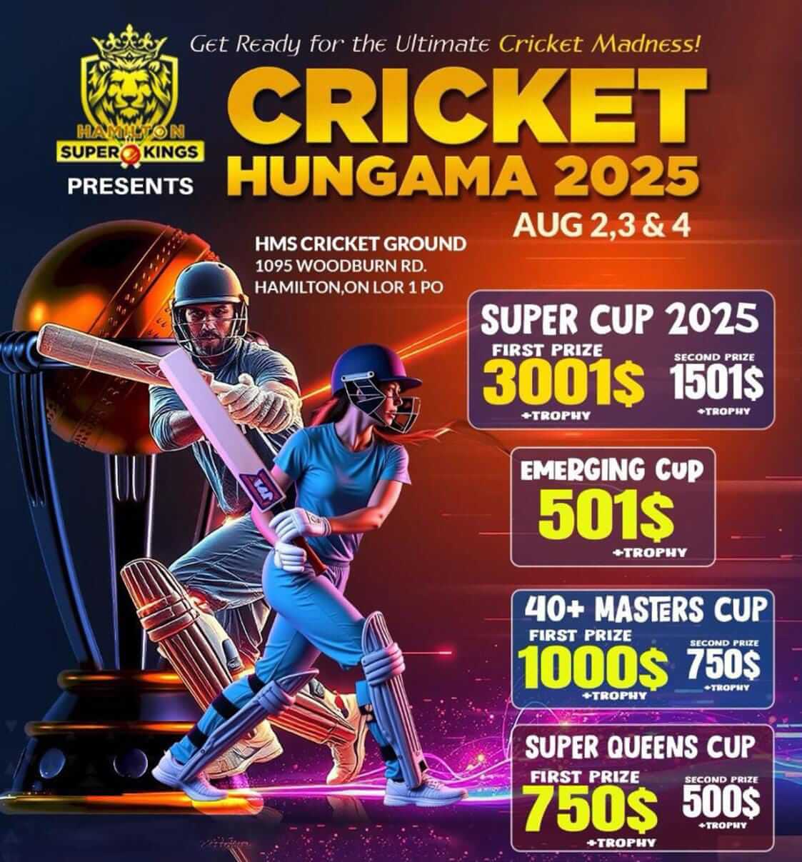 ടൊറൻ്റോ : ഇനി ക്രിക്കറ്റ് ആരവങ്ങൾക്ക് ചെവിയോർക്കാം. ഒൻ്റാരിയോയിലെ ഏറ്റവും വലിയ ക്രിക്കറ്റ് ടൂര്‍ണമെൻ്റിന് ഹാമില്‍ട്ടണ്‍ വേദിയാകുന്നു. ഹാമില്‍ട്ടണ്‍ സൂപ്പര്‍ കിങ്സിന്‍റെ ആഭിമുഖ്യത്തിൽ മൂന്ന് ദിവസം നീളുന്ന ക്രിക്കറ്റ് ഹംഗാമ- 2025-ന് ഓഗസ്റ്റ് 2 ശനിയാഴ്ച തുടക്കമാകും. ഓഗസ്റ്റ് 2 മുതൽ 4 വരെ ഹാമില്‍ട്ടണ്‍ മലയാളി സമാജം മൈതാനത്ത് നടക്കുന്ന ടൂര്‍ണമെൻ്റിൽ മൂന്ന് വിഭാഗങ്ങളിലായി 28 ടീമുകള്‍ പങ്കെടുക്കും. എവര്‍ റോളിങ് ട്രോഫികളും പതിനായിരത്തോളം ഡോളറുമാണ് വിജയികളെ കാത്തിരിക്കുന്നത്.