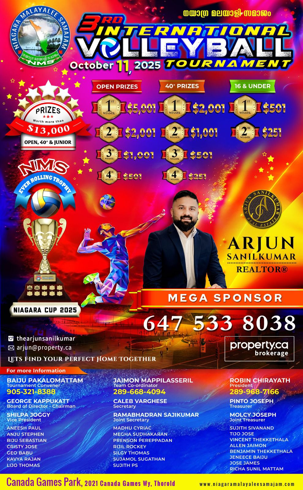 നയാഗ്ര ഫോൾസ് : നയാഗ്ര മലയാളീ സമാജത്തിന്റെ മൂന്നാമത് രാജ്യാന്തര വോളിബോൾ ടൂർണമെൻ്റ് ഒക്ടോബർ 11 ശനിയാഴ്ച നയാഗ്രയിലെ കാനഡ ഗെയിംസ് പാർക്കിൽ നടക്കും. ടീമുകളുടെ പങ്കാളിത്തം കൊണ്ടും സമ്മാനത്തുക കൊണ്ടും കാനഡയിലെ ഏറ്റവും വലിയ വോളിബോൾ ടൂർണമെൻ്റാണിതെന്ന് സമാജം പ്രസിഡൻ്റ് റോബിൻ ചിറയത്ത്, ടൂർണമെൻ്റ് കൺവീനർ ബൈജു പകലോമറ്റം എന്നിവർ അറിയിച്ചു. കാനഡ ഗെയിംസ് പാർക്കിൽ രാജ്യാന്തരനിലവാരത്തിൽ ഒരുക്കിയിരിക്കുന്ന നാല് കോർട്ടുകളിലാണ് മത്സരങ്ങൾ നടക്കുക. കാനഡയിൽ നിന്നുള്ള ടീമുകൾക്ക് പുറമെ യുഎസിൽ നിന്നും ടീമുകൾ പങ്കെടുക്കും. റിയൽറ്റർ അർജുൻ സനൽകുമാർ, ജെയിംസ് ഓട്ടോ ഗ്രൂപ്പിലെ ബോബൻ ജെയിംസ് എന്നിവരാണ് ടൂർണമെൻ്റിന്റെ മെഗാ സ്പോൺസർമാർ.