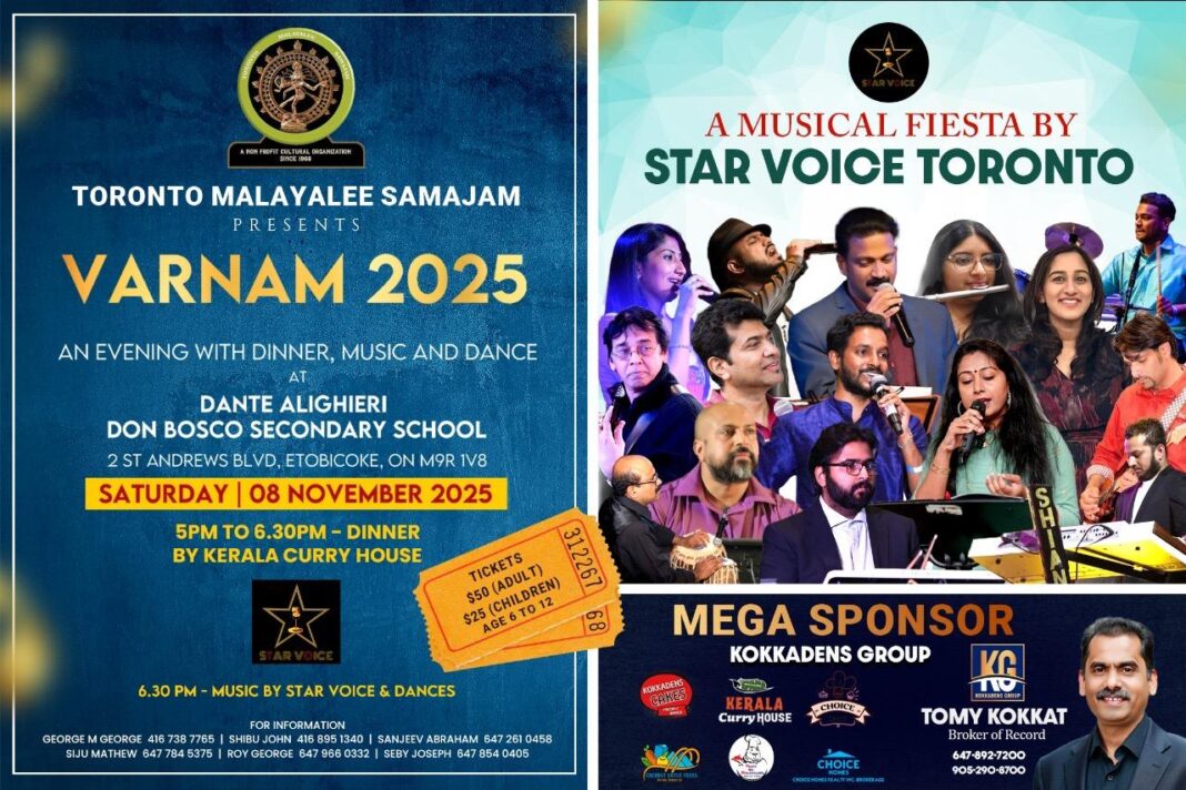 ടൊറന്റോ : ടൊറന്റോ മലയാളി സമാജത്തിന്റെ ‘വർണം 2025’ നവംബർ 8ന് നടക്കും. എറ്റോബിക്കോയിലെ ഡാന്റെ അലീഗിയേരി – ഡോൺ ബോസ്കോ സെക്കണ്ടറി സ്കൂളിൽ വെച്ചാണ് പരിപാടി. വൈകിട്ട് അഞ്ച് മുതല് ആറര വരെ കേരള കറി ഹൗസ് ഒരുക്കുന്ന ഡിന്നറോടെയാണ് പരിപാടിക്ക് തുടക്കം കുറിക്കുന്നത്. തുടർന്ന് സ്റ്റാർ വോയ്സ് അവതരിപ്പിക്കുന്ന സംഗീത പരിപാടിയും വിവിധ കലാപരിപാടികളും നൃത്താവതരണങ്ങളും അരങ്ങേറും.