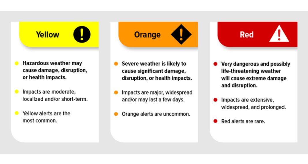 ഓറഞ്ച് – അസാധാരണ കാലാവസ്ഥ സമയത്ത് ഉപയോഗിക്കുന്നു. ആഘാതങ്ങൾ “വലുതും വ്യാപകവും/അല്ലെങ്കിൽ കുറച്ച് ദിവസം നീണ്ടുനിൽക്കുന്നതുമായിരിക്കും”, “കാര്യമായ നാശനഷ്ടങ്ങൾ, തടസ്സങ്ങൾ, ആരോഗ്യ പ്രത്യാഘാതങ്ങൾ” ഉണ്ടാക്കാൻ സാധ്യത