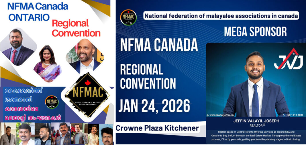കിച്ചനർ : കാനഡയിലെ മലയാളി സംഘടനകളുടെ കൂട്ടായ്മയായ നാഷണൽ ഫെഡറേഷൻ ഓഫ് മലയാളീ അസോസിയേഷൻ ഇൻ കാനഡ (NFMA Canada) ഒൻ്റാരിയോ റീജനൽ കൺവെൻഷൻ 2026 ജനുവരി 24 ശനിയാഴ്ച നടക്കും.