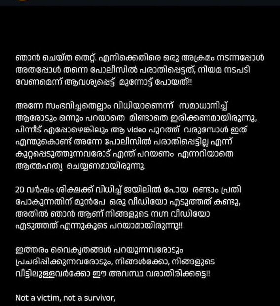പിന്നീട് എപ്പോഴെങ്കിലും ആ video പുറത്ത് വരുമ്പോൾ ഇത് എന്തുകൊണ്ട് അന്നേ പോലീസിൽ പരാതിപ്പെട്ടില്ല എന്ന് കുറ്റപ്പെടുത്തുന്നവരോട് എന്ത് പറയണം എന്നറിയാതെ ആത്മഹത്യ ചെയ്യണമായിരുന്നു. 20 വർഷം ശിക്ഷക്ക് വിധിച്ച് ജയിലിൽ പോയ രണ്ടാം പ്രതി പോകുന്നതിന് മുൻപേ ഒരു വീഡിയോ എടുത്തത് കണ്ടു, അതിൽ ഞാൻ ആണ് നിങ്ങളുടെ നഗ്ന വീഡിയോ എടുത്തത് എന്നുകൂടെ പറയാമായിരുന്നു!! ഇത്തരം വൈകൃതങ്ങൾ പറയുന്നവരോടും പ്രചരിപ്പിക്കുന്നവരോടും, നിങ്ങൾക്കോ, നിങ്ങളുടെ വീട്ടിലുള്ളവർക്കോ ഈ അവസ്ഥ വരാതിരിക്കട്ടെ!!
