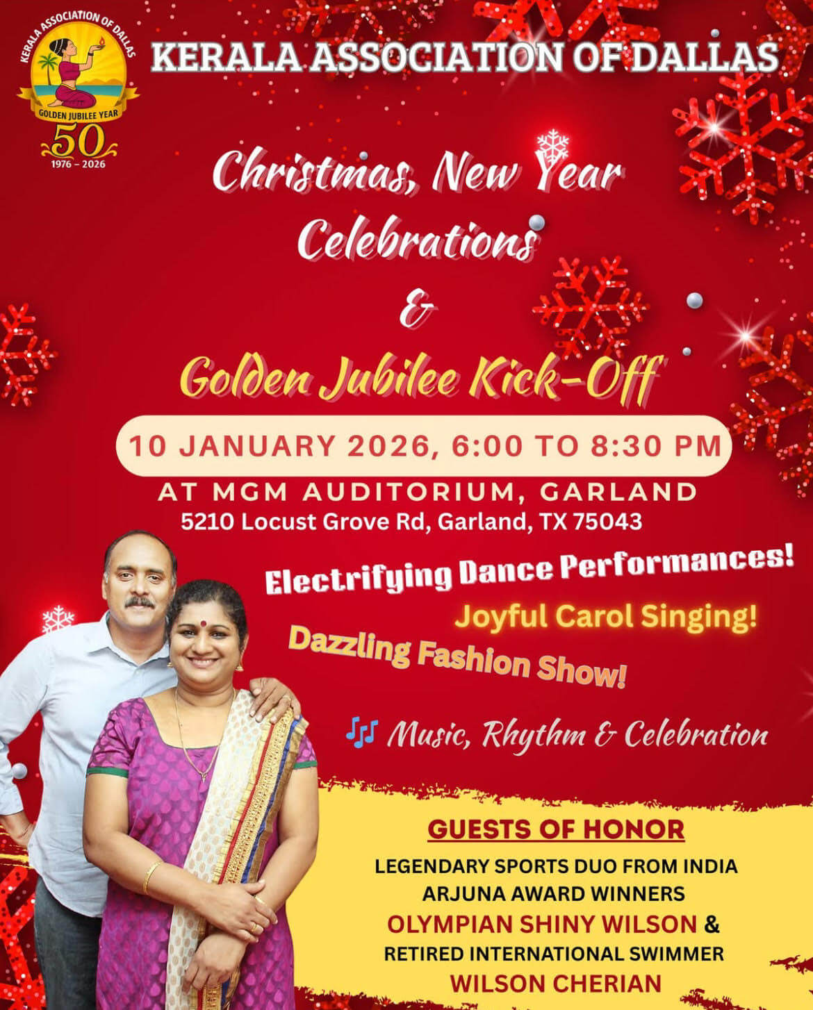 ഡാലസ് : കേരള അസോസിയേഷൻ ഓഫ് ഡാലസിന്‍റെ ക്രിസ്മസ്-പുതുവത്സരാഘോഷ പരിപാടികൾ ജനുവരി പത്തിന് നടക്കും. ഗാർലൻഡിലെ എംജിഎം ഓഡിറ്റോറിയത്തിൽ വൈകുന്നേരം 6 മണി മുതൽ 8:30 വരെയാണ് ആഘോഷങ്ങൾ സംഘടിപ്പിച്ചിരിക്കുന്നത്. ചടങ്ങിൽ അസോസിയേഷന്‍റെ 50-ാം വാർഷികാഘോഷങ്ങൾക്കും തുടക്കം കുറിക്കും. ഇന്ത്യൻ കായികരംഗത്തെ ഇതിഹാസ ദമ്പതികളായ പത്മശ്രീ ഷൈനി വിത്സനും വിത്സൻ ചെറിയാനും മുഖ്യാതിഥികളായി പങ്കെടുക്കും. ചടങ്ങിൽ പുതിയതായി തിരഞ്ഞെടുക്കപ്പെട്ട പ്രസിഡൻ്റ് ഷിജു അബ്രഹാമിന്‍റെ നേതൃത്വത്തിലുള്ള പുതിയ ഭരണസമിതി ചുമതലയേൽക്കും.