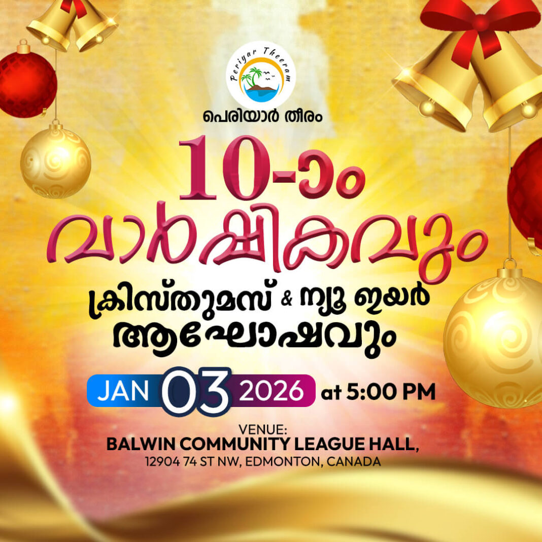 എഡ്മിന്റൻ : എഡ്മിന്റനിലെ മലയാളി കൂട്ടായ്മയായ പെരിയാർതീരം പത്താം വാർഷികം ആഘോഷിക്കുന്നു. ജനുവരി മൂന്നിന് എഡ്മിന്റനിലെ ബാൽവിൻ കമ്മ്യൂണിറ്റി ഹാളിൽ നടക്കുന്ന പരിപാടിയിൽ ക്രിസ്മസ്-ന്യൂ ഇയർ ആഘോഷവും ഒരുക്കിയിട്ടുണ്ട്. ദശാബ്ദവാർഷികതോടനുബന്ധിച്ചു അംഗങ്ങളുടെ കുടുംബഫോട്ടോയും, ഇതുവരെയുള്ള പ്രവർത്തങ്ങളുടെ വിവരണങ്ങളും, ഫോട്ടോകളും അടങ്ങിയ സ്മരണിക വാർഷിക പരിപാടിയിൽ പ്രസിദ്ധീകരിക്കും. അങ്കമാലി-കാലടി ഭാഗത്ത് നിന്നും എഡ്മിന്റനിൽ താമസിക്കുന്ന മലയാളികളുടെ കൂട്ടായ്മയാണ് പെരിയാർതീരം.