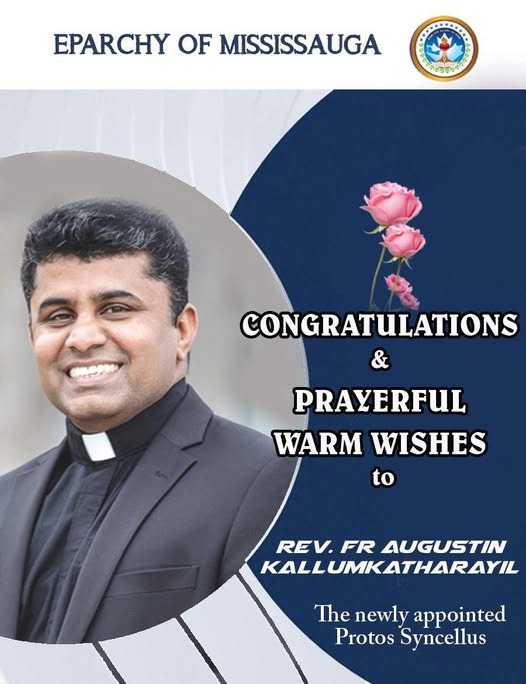 മിസ്സിസാഗ: മിസ്സിസാഗ രൂപതയുടെ പ്രോട്ടോ സിഞ്ചെല്ലസ് ആയി ഫാദർ അഗസ്റ്റിൻ കല്ലുങ്കത്തറയിൽ നിയമിതനായി. 2019 മുതൽ സേവനമനുഷ്ഠിച്ചിരുന്ന ഫാദർ പത്രോസ് ചമ്പക്കര കാനഡയിലെ സേവനം പൂർത്തിയാക്കി അമേരിക്കയിലേക്ക് പോകുന്ന സാഹചര്യത്തിലാണ് ഈ പുതിയ നിയമനം.