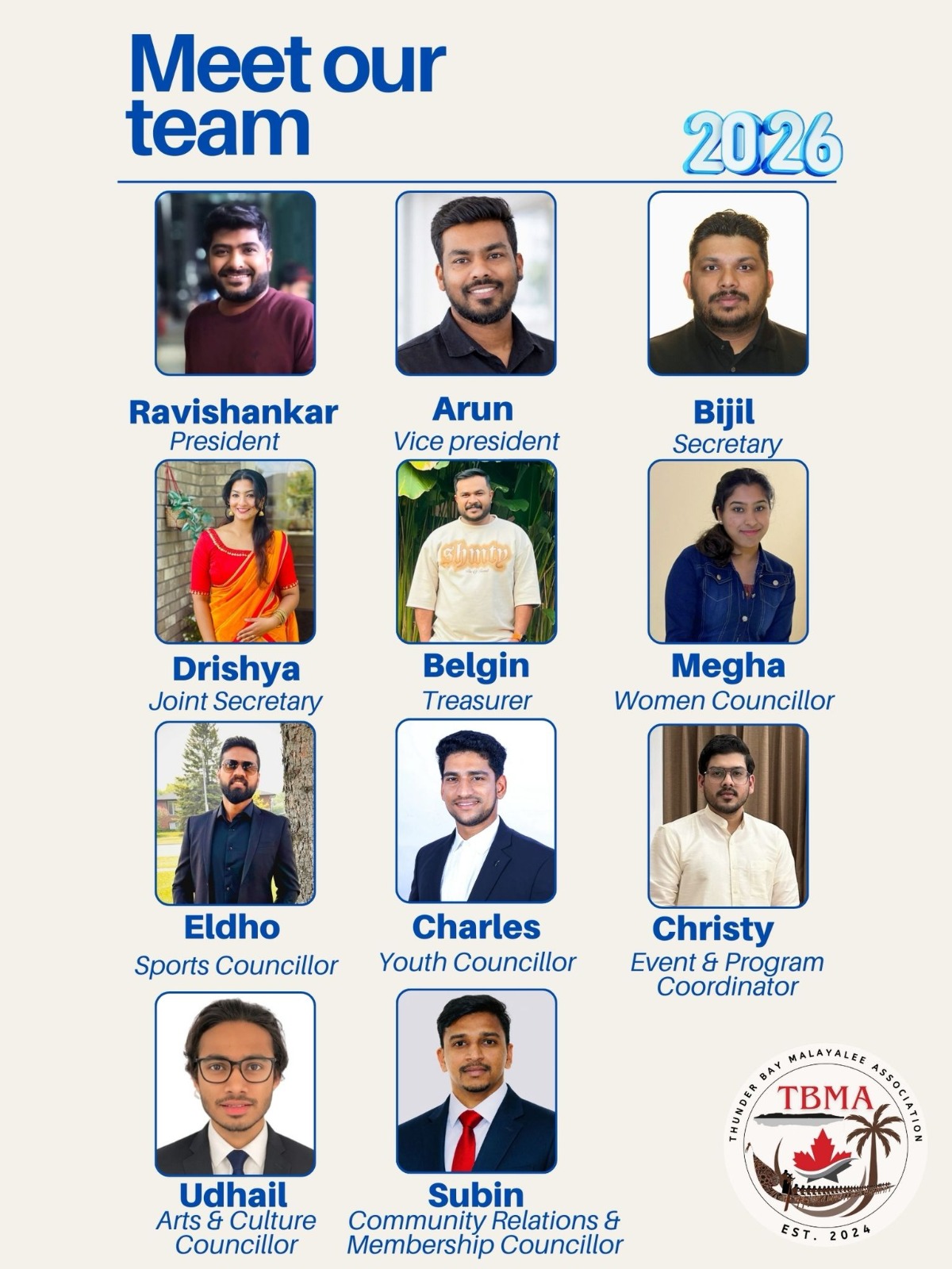 തണ്ടർബേ : തണ്ടർബേ മലയാളി അസ്സോസിയേഷൻ 2026 വർഷത്തേക്കുള്ള പുതിയ എക്സിക്യൂട്ടീവ് കമ്മിറ്റിയെ തിരഞ്ഞെടുത്തു. രവി ശങ്കറാണ് പതിനൊന്നംഗ കമ്മിറ്റിയുടെ പ്രസിഡന്റ്. ബിജിൽ സെക്രട്ടറിയായി തിരഞ്ഞെടുക്കപ്പെട്ടു. അരുൺ വൈസ് പ്രസിഡന്റും ദൃശ്യ ജോയിന്റ് സെക്രട്ടറിയുമാണ്. ബെൽജിനാണ് ട്രഷറർ.