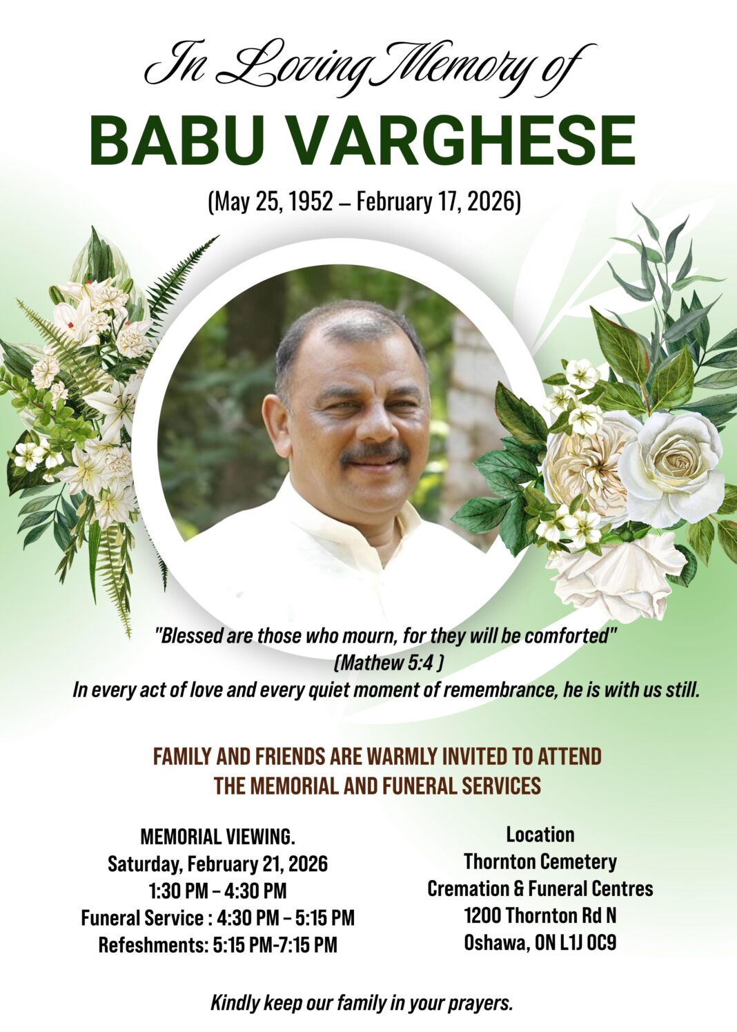 ഓഷവ: ബാബു വര്‍ഗീസ്(73) അന്തരിച്ചു. ഡി-തിയറ്റേഴ്സ് അംഗം നീതു ബാബുവിന്റെ പിതാവാണ് അദ്ദേഹം. ബാബു വര്‍ഗീസിന്റെ വ്യൂയിങ് ഫെബ്രുവരി 21 ശനിയാഴ്ച നടക്കും. ഉച്ചയ്ക്ക് 1.30 മുതല്‍ വൈകിട്ട് 4.30 വരെ ഓഷവയിലെ തോണ്‍ടണ്‍ സെമിത്തേരി & ക്രിമിറ്റോറിയത്തിലാണ് (1200 Thornton Rd N, Oshawa, ON L1J 0C9) വ്യൂയിങ് ഒരുക്കിയിരിക്കുന്നത്. തുടര്‍ന്ന് വൈകിട്ട് 4.30 മുതല്‍ 5.15 വരെ സംസ്‌കാര ശുശ്രൂഷകളും നടക്കുമെന്ന് കുടുംബാംഗങ്ങള്‍ അറിയിച്ചു.