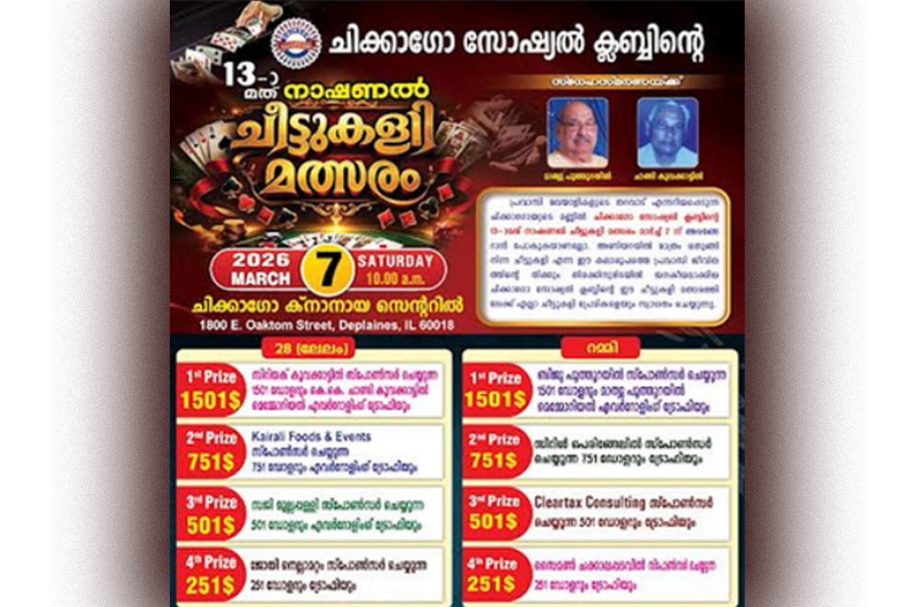 ഷിക്കാഗോ സോഷ്യൽ ക്ലബ്ബിന്‍റെ ചീട്ടുകളി മത്സരം മാർച്ച് 7 ശനിയാഴ്ച്ച