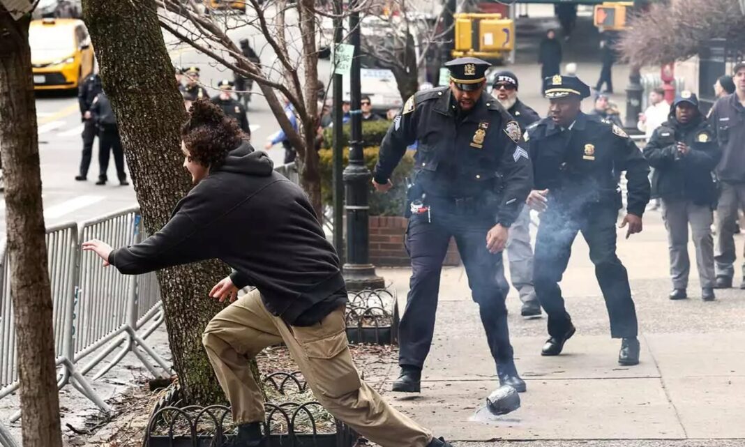 ബോള്ട്ടുകളും സ്ക്രൂകളും നിറച്ച നിലയിലായിരുന്നു സ്ഫോടക വസ്തുവെന്ന് പൊലീസ് കണ്ടെത്തി. എന്നാല് ഇത് പ്രതിഷേധക്കാരല്ല എറിഞ്ഞതെന്നും, മറിച്ച് പ്രതിഷേധക്കാര്ക്ക് നേരെ മറ്റൊരാള് എറിഞ്ഞതാണെന്നുമാണ് പ്രാഥമിക നിഗമനം. ഇതിന് പിന്നാലെ പ്രതിഷേധക്കാര്ക്കിടയില് ആരോ പെപ്പര് സ്പ്രേ ഉപയോഗിച്ചതോടെ പ്രകടനം അക്രമാസക്തമായി. സംഭവവുമായി ബന്ധപ്പെട്ട് മൂന്ന് പേരെ പൊലീസ് അറസ്റ്റ് ചെയ്തിട്ടുണ്ട്. ന്യൂയോര്ക്ക് നഗരത്തിലെ ഇസ്ലാമികവല്ക്കരണം അവസാനിപ്പിക്കണമെന്ന ആവശ്യവുമായാണ് ജെയ്ക്ക് ലാങ്ങിന്റെ നേതൃത്വത്തില് ജനങ്ങള് തെരുവിലിറങ്ങിയത്.