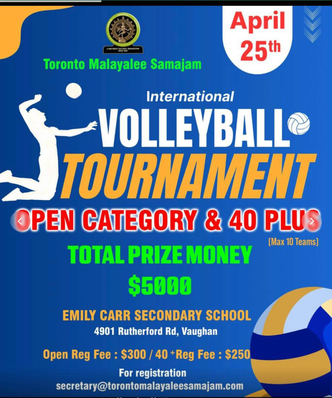40+ വിഭാഗത്തിൽ 250 ഡോളറും ഓപ്പൺ കാറ്റഗറിയിൽ 300 ഡോളറുമായിരിക്കും രജിസ്ട്രേഷൻ ഫീസ്. രജിസ്ട്രേഷൻ ലിങ്ക് : secretary@torontomalayaleesamajam.com.