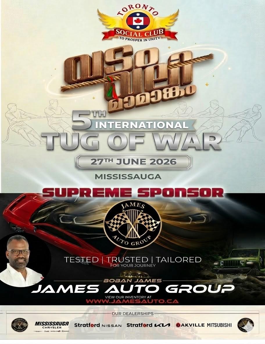 മിസ്സിസാഗ: മിസ്സിസാഗ നഗരത്തെ ആവേശത്തിലാഴ്ത്താന് ടൊറന്റോ സോഷ്യല് ക്ലബിന്റെ അഞ്ചാമത് അന്താരാഷ്ട്ര വടംവലി മാമാങ്കം ജൂണ് 27ന്. മലയാളികള് കാത്തിരിക്കുന്ന ഈ വടംവലി മഹോത്സവത്തിന്റെ മുഖ്യ സ്പോണ്സര് പ്രമുഖ വ്യവസായിയും ജെയിംസ് ഓട്ടോ ഗ്രൂപ്പ് സിഇഒയുമായ ബോബന് ജെയിംസ് ആണ്.