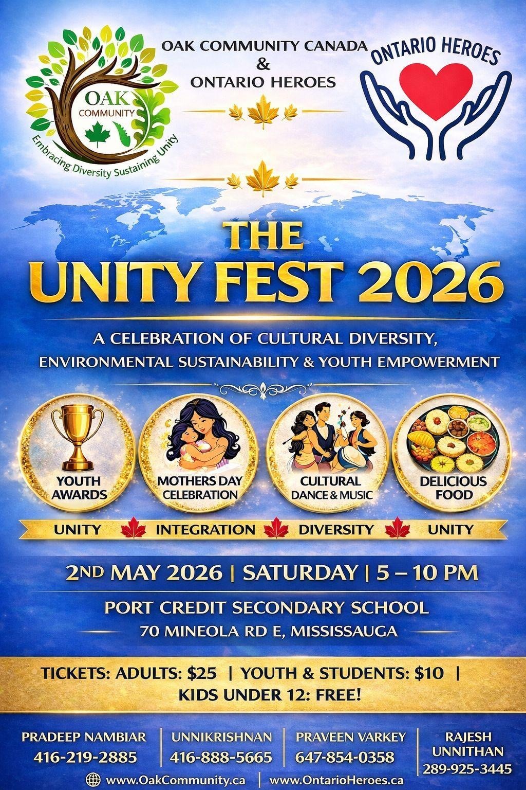 മാതൃദിനാഘോഷത്തിന്റെ ഭാഗമായുള്ള അമ്മമാരുടെ നൃത്തവും യുവപ്രതിഭകളുടെ വൈവിധ്യമാർന്ന കലാപ്രകടനങ്ങളും ഫെസ്റ്റിന്റെ പ്രധാന ആകർഷണങ്ങളായിരിക്കും. വിവിധ സംസ്കാരങ്ങളെ സമന്വയിപ്പിക്കുന്ന സാംസ്കാരിക പരിപാടികൾക്കൊപ്പം വിഭവസമൃദ്ധമായ ഡിന്നറും ആഘോഷത്തിന്റെ ഭാഗമായി ഒരുക്കിയിട്ടുണ്ട്. 50 ഡോളറിന്റെ വിഐപി ടിക്കറ്റുകൾക്ക് പുറമെ മുതിർന്നവർക്ക് 25, വിദ്യാർത്ഥികൾക്ക് 10 എന്നിങ്ങനെയാണ് ടിക്കറ്റ് നിരക്കുകൾ. 12 വയസ്സിൽ താഴെയുള്ള കുട്ടികൾക്ക് പ്രവേശനം സൗജന്യമാണ്. ടിക്കറ്റുകൾക്കും കൂടുതൽ വിവരങ്ങൾക്കുമായി ഓക്ക് കമ്മ്യൂണിറ്റി കാനഡയുടെയോ ഒന്റാരിയോ ഹീറോസിന്റെയോ ഔദ്യോഗിക വെബ്സൈറ്റുകൾ സന്ദർശിക്കാവുന്നതാണ്.