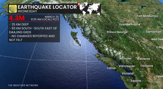വൻകൂവർ : ബ്രിട്ടിഷ് കൊളംബിയയുടെ വടക്കൻ തീരത്ത് 4.3 തീവ്രത രേഖപ്പെടുത്തിയ ഭൂചലനം അനുഭവപ്പെട്ടതായി എർത്ത്ക്വേക്ക് കാനഡ അറിയിച്ചു. ഹൈദ ഗ്വായിയുടെ ദ്വീപസമൂഹത്തിലെ ചെറിയ ഗ്രാമമായ ഡാജിംഗ് ഗൈഡിന് ഏകദേശം 93 കിലോമീറ്റർ അകലെ ബുധനാഴ്ച രാവിലെ 6:25 നാണ് ഭൂചലനം റിപ്പോർട്ട് ചെയ്തതെന്ന് ഏജൻസി പറയുന്നു. നാശനഷ്ടങ്ങൾ റിപ്പോർട്ട് ചെയ്തിട്ടില്ലെന്നും പ്രതീക്ഷിക്കുന്നില്ലെന്നും ഏജൻസി റിപ്പോർട്ട് ചെയ്തു.