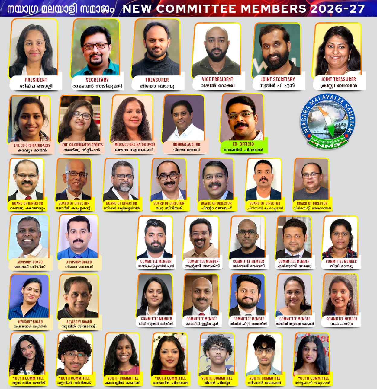 നയാഗ്ര ഫാൾസ്: നയാഗ്ര മലയാളി സമാജം 2026-27ലേക്കുള്ള ഭാരവാഹികളെ തിരഞ്ഞെടുത്തു. നയാഗ്ര ഫാൾസിലെ എ ൻ മേയർ പബ്ലിക് സ്കൂളിൽ നടന്ന വാർഷിക പൊതുയോഗത്തിലാണു പുതിയ ഭരണസമിതിയെ തിരഞ്ഞെടുത്തത്. ശില്പാ ജൊഗ്ഗിയെ പ്രസിഡന്റായും രാമഭദ്രൻ സജികുമാരിനെ സെക്രട്ടറിയായും നിശ്ചയിച്ചു. ജിയോ ബാബു ആണ് ട്രഷറർ. റിജിൽ റോക്കിയാണ് വൈസ് പ്രസിഡന്റ്. സുജിത് പി എസ് ജോയിന്റ് സെക്രട്ടറിയായും ക്രിസ്റ്റി ബിബിൻ ജോയിന്റ് ട്രഷററായും തിരഞ്ഞെടുക്കപ്പെട്ടു. കമ്മിറ്റി അംഗങ്ങൾ എല്ലാവരും പുതിയ ആളുകളാണ്. അലൻ ചിട്ടിപ്പറമ്പിൽ, ആന്റണി അലക്സ്, ബിജോയ് ജേക്കബ്, എൽദോസ് സാബു, ജിനി മാത്യു, ലിജി സൂസൻ വർഗീസ്, മൊവിന് ഇട്ടിയച്ചൻ, നിതിൻ പീറ്റർ ബെന്നിസ്, ശാലിനി സുരേന്ദ്ര മോഹൻ, വഫ ഹസ്ന എന്നിവരാണ് കമ്മിറ്റി അംഗങ്ങൾ. എക്സ്. ഒഫിസിയോ റോബിൻ ചിറയത്ത്, കാവ്യാ രാജൻ ആർട്സ് കോ-ഓർഡിനേറ്റർ, അഞ്ചു സ്റ്റീഫൻ സ്പോർട്സ് കോ-ഓർഡിനേറ്റർ, മേഘാ സുധാകരൻ മീഡിയ കോ-ഓർഡിനേറ്റർ (പി.ആർ.ഒ), ടിജോ ജോസ് ആണ് ഇന്റേണൽ ഓഡിറ്റർ.