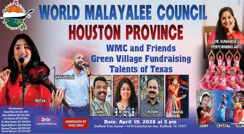 സംഗീതം, നൃത്തം, നാടകം, വൈവിധ്യമാര്‍ന്ന മറ്റു കലാ പ്രകടനങ്ങള്‍ എന്നിവ ഗ്രാന്‍ഡ് ഫണ്ട്റൈസിങ് ടാലൻ്റ് ഫെസ്റ്റിൽ ഒരുക്കിയിട്ടുണ്ട്. ഈ പരിപാടി വെറും പ്രതിഭകളുടെആഘോഷമല്ല, മറിച്ച് മഹത്തായ ഒരു ലക്ഷ്യത്തിനായി മനുഷ്യ മനസ്സുകളെ ഒന്നിപ്പിക്കുന്നതിനുള്ള വേദിയാണ്,” വേൾഡ് മലയാളി കൗണ്‍സില്‍ വക്താവ് അറിയിച്ചു. കൂടുതൽ വിവരങ്ങൾക്ക് എസ് കെ ചെറിയാന്‍ – 281 513 5961.