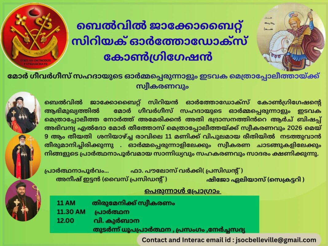 ബെൽവിൽ ജാക്കോബൈറ്റ് സിറിയൻ ഓർത്തഡോക്സ് കോൺഗ്രിഗേഷന്റെ ആഭിമുഖ്യത്തിൽ മോർ ഗീവർഗീസ് സഹദായുടെ ഓർമ്മപ്പെരുന്നാളും ഇടവക മെത്രാപ്പോലിതയായ നോർത്ത് അമേരിക്കൻ അതിഭദ്രാസനത്തിന്റെ ആർച്ച് ബിഷപ്പ് അഭിവന്ദ്യ എൽദോ മോർ തിമോത്തിയോസ് മെത്രാപ്പോലിത്തായ്‌ക്ക്‌ സ്വീകരണവും 2026 മേയ് 9 ആം തീയതി ശനിയാഴ്ച രാവിലെ 11 മണിക്ക് വിപുലമായ രീതിയിൽ നടക്കും.
